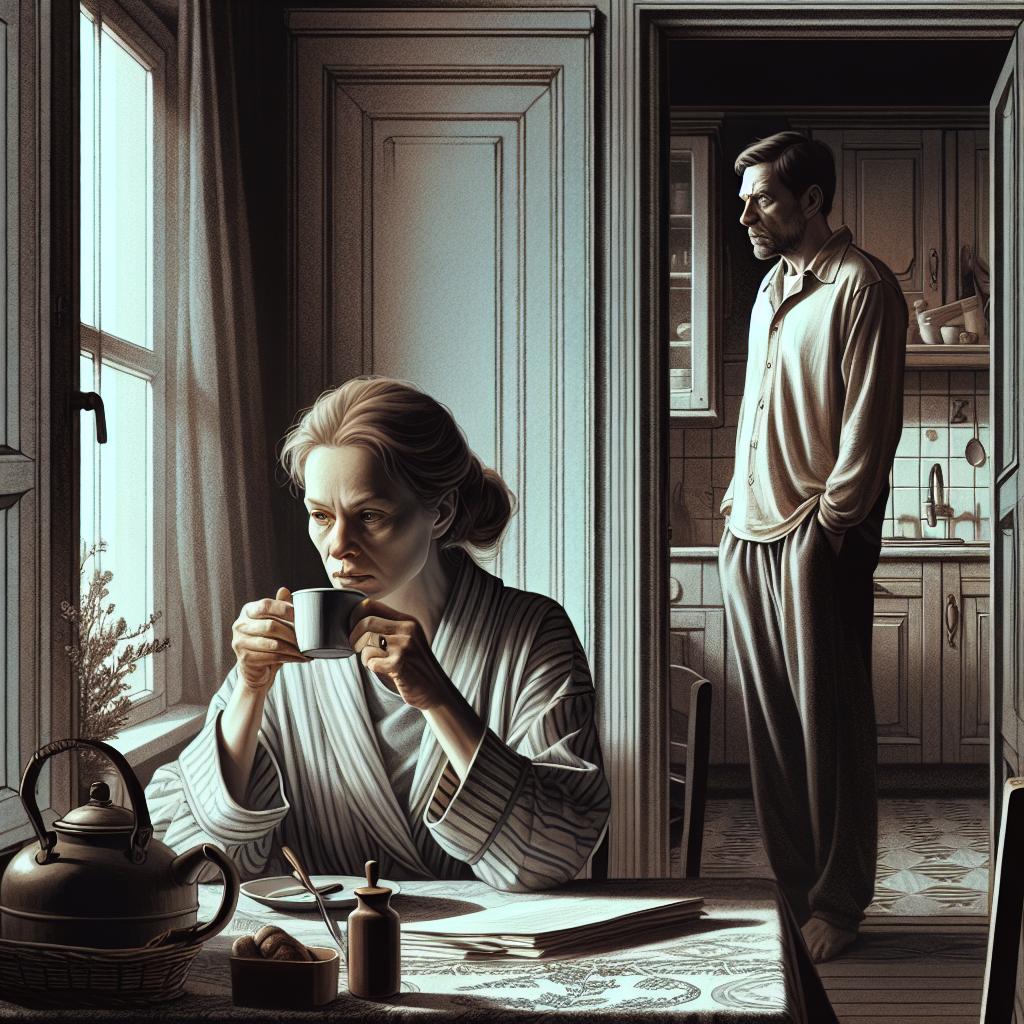 Выйдя в коридор, он увидел жену, сидевшую за столом с чашкой кофе в руках, задумчиво глядевшую в окно.