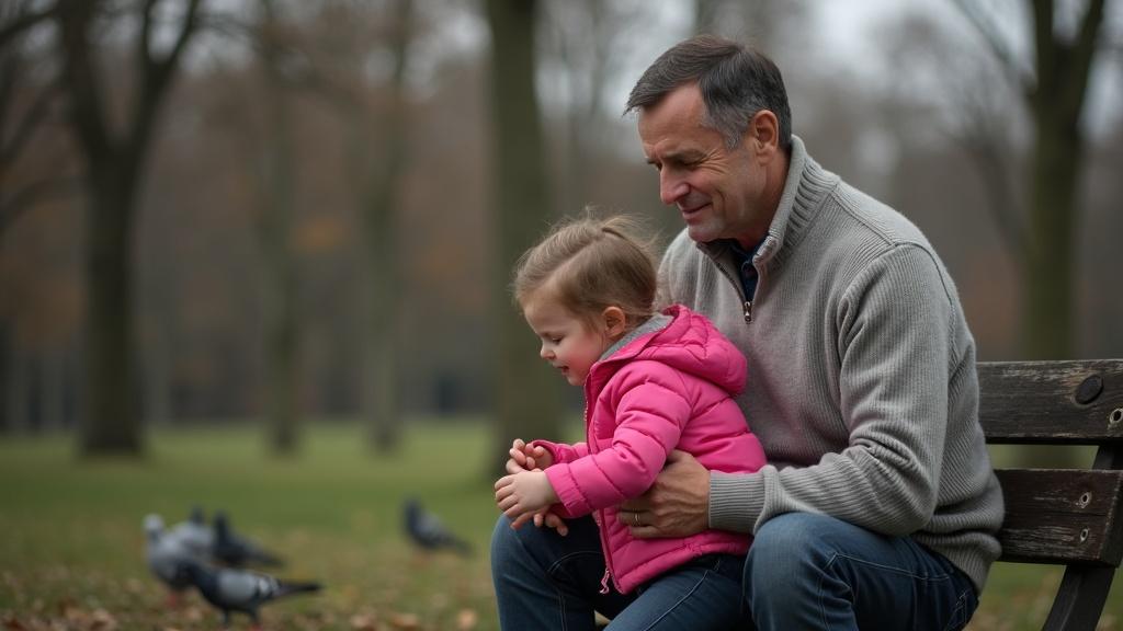 Алексей устроился на скамейке в парке, наблюдая, как его семилетняя дочь Настя с увлечением гоняет голубей.