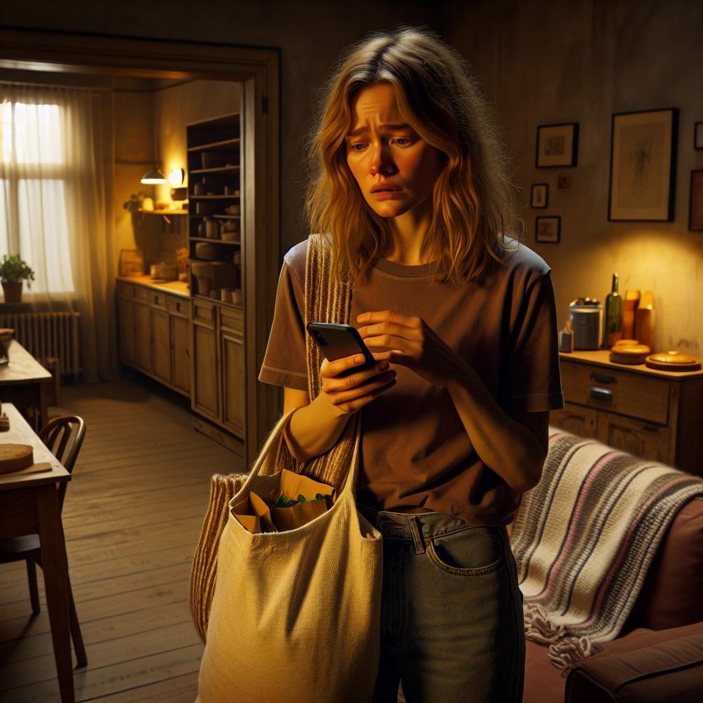 Рука, удерживающая три пакета с продуктами, была перегружена, и она выругалась, стараясь удержать всё и одновременно достать мобильный.