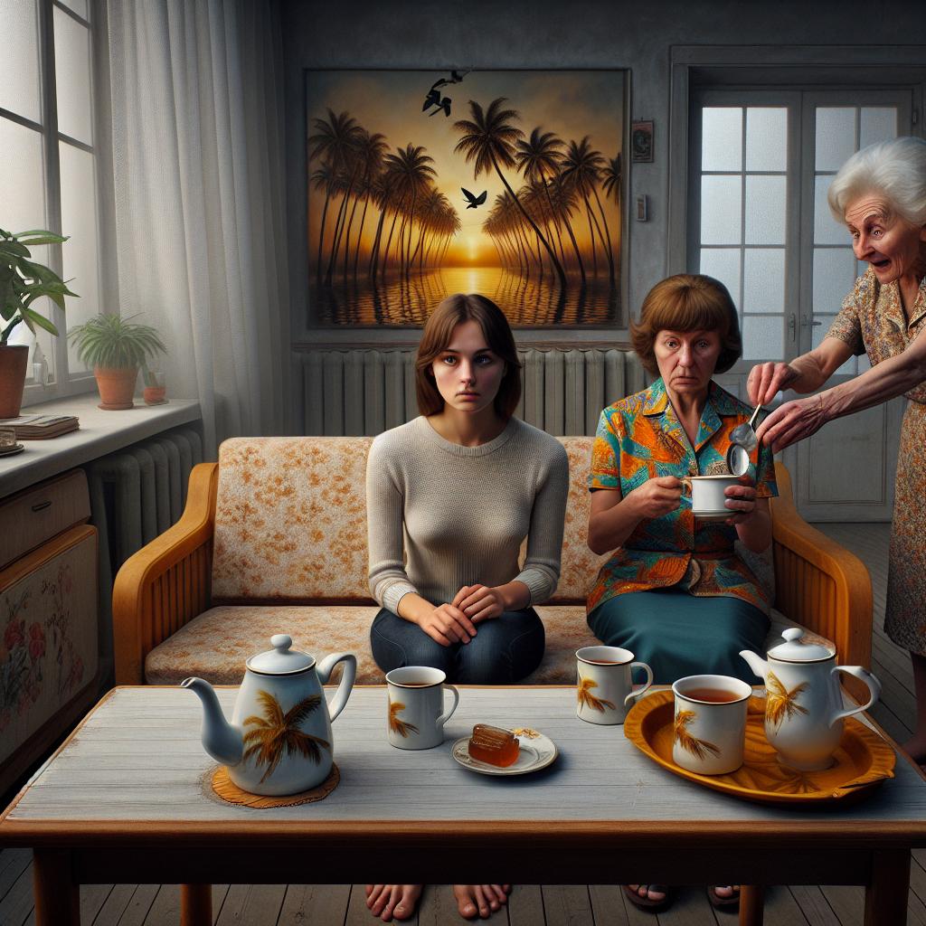 Ирина сидела на краю дивана, словно ученица, которую вот-вот вызовут к доске. На столе перед ней лежала яркая путёвка в Лазурное — с золотыми пальмами и надписью: «Поздравляем! Вы — победитель!». Улыбка, не сходившая с её лица ещё с пятницы, начинала медленно исчезать. Настроение стремительно ухудшалось. Из кухни доносился звон ложек — это Лариса разливала чай по своим тяжёлым чашкам с изображением лебедей. Эти чашки Ирина терпеть не могла — они казались ей символом чего-то непоколебимого, нелепого и громоздкого.