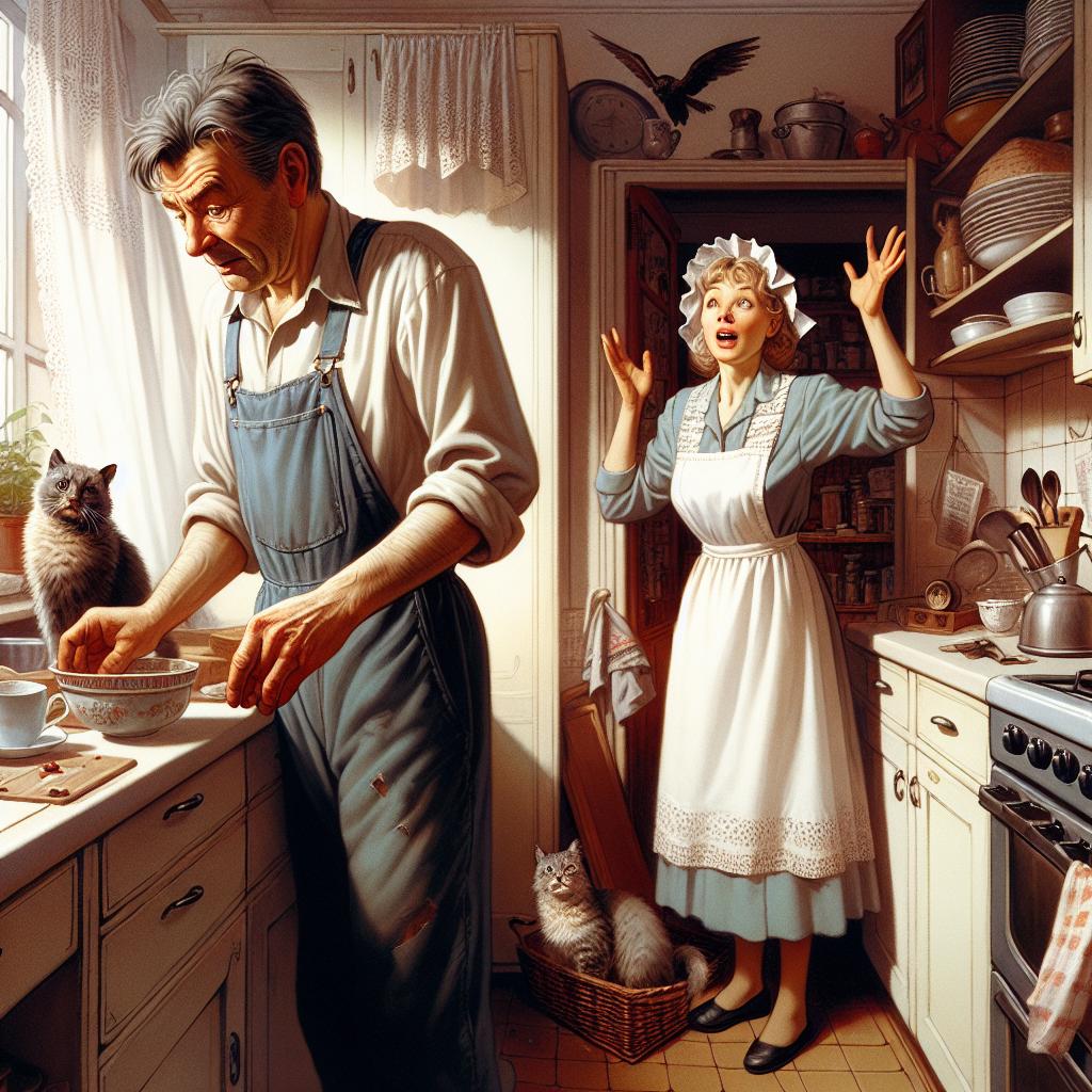 На кухне вдруг раздался громкий звук — что-то с грохотом разбилось! Коты в панике выскочили из кухни, разбежавшись по углам.