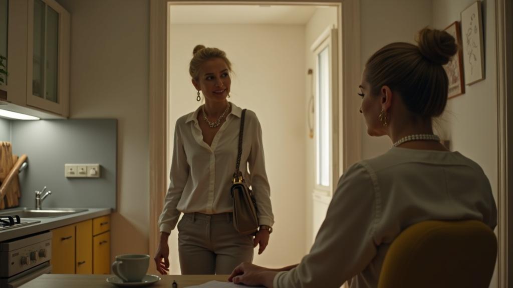 Она направилась на кухню. Там, за её столом и на её любимом стуле с жёлтой подушкой, сидела женщина лет пятидесяти. Волосы собраны в строгий пучок, на шее — жемчужное ожерелье, руки украшал безупречный маникюр. Перед ней стояла чашка с кофе и блокнот с мелко исписанными страницами. Женщина подняла взгляд и улыбнулась. Улыбка была приветливой, но глаза оставались холодными.