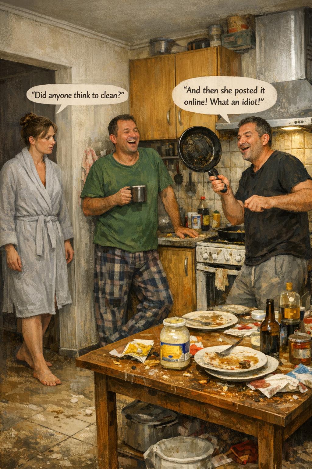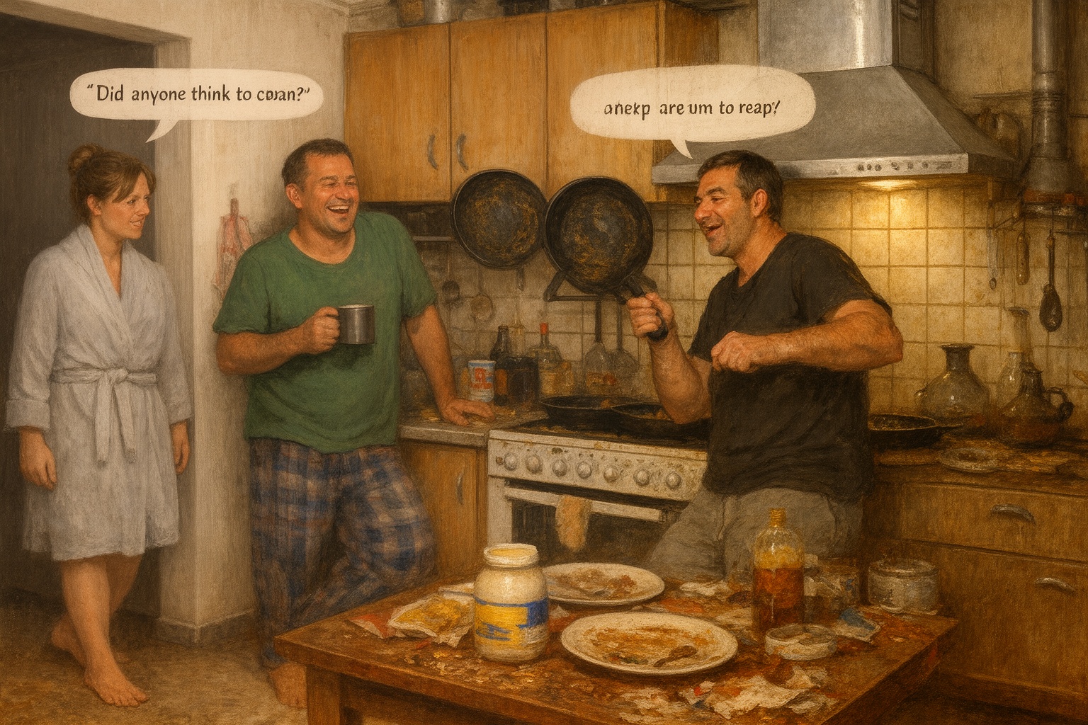Кухня выглядела так, будто через неё прошёл гастрономический парад. На столе стояла банка с остатками майонеза, рядом валялась горчица и порванный пакет; тарелки были облеплены вилками с засохшими остатками еды. Пол усеян крошками и пятнами жира. Плита блестела от масляных разводов.
