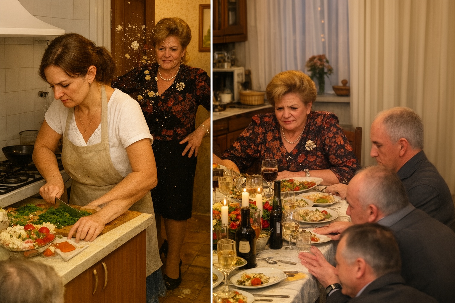 Я даже головы не повернула, продолжая мелко крошить зелень. Лезвие размеренно постукивало о разделочную доску. До прихода приглашённых оставалось не больше получаса, а моя «обожаемая» родственница явилась с проверкой ещё днём. За эти несколько часов я успела выслушать, что пол у меня липкий, занавески — безвкусные, а выгляжу я так, будто только что вернулась с тяжёлой разгрузки.