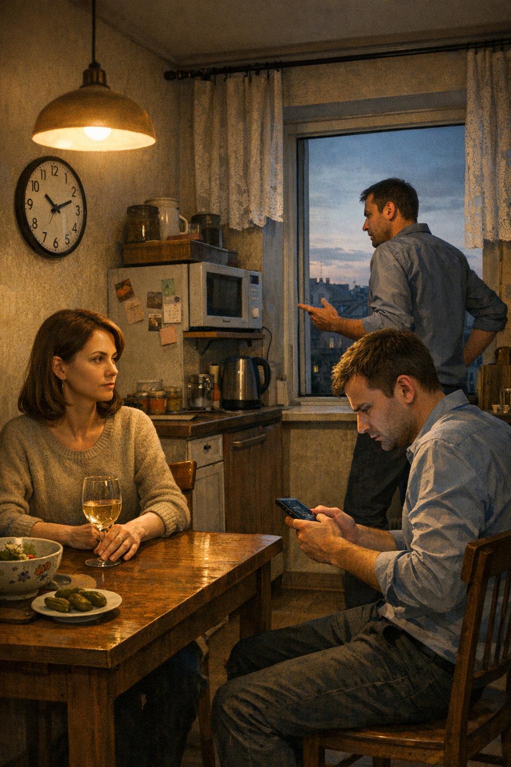 Вечерний свет — теплый, медовый — лился из-под абажура, выхватывая из сумрака кухни две тарелки, пустой салатник и пару бокалов. В одном плескалось немного белого вина, второй оставался сухим. Тишину разрезало лишь ровное тиканье настенных часов.