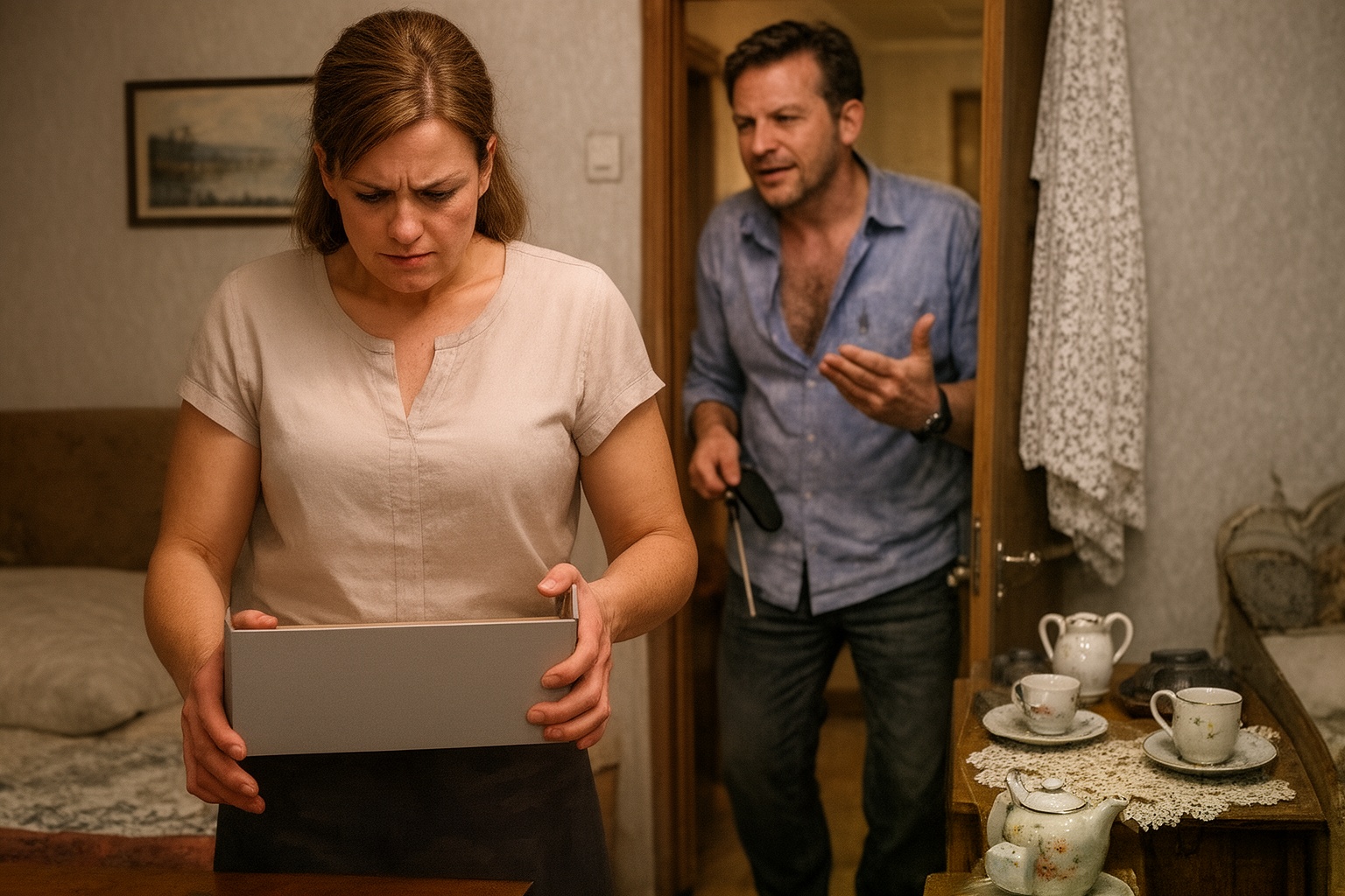 Он вошёл в комнату с улыбкой. Но стоило ему заметить коробку в её руках, как эта улыбка сползла, будто плохо приклеенные обои.