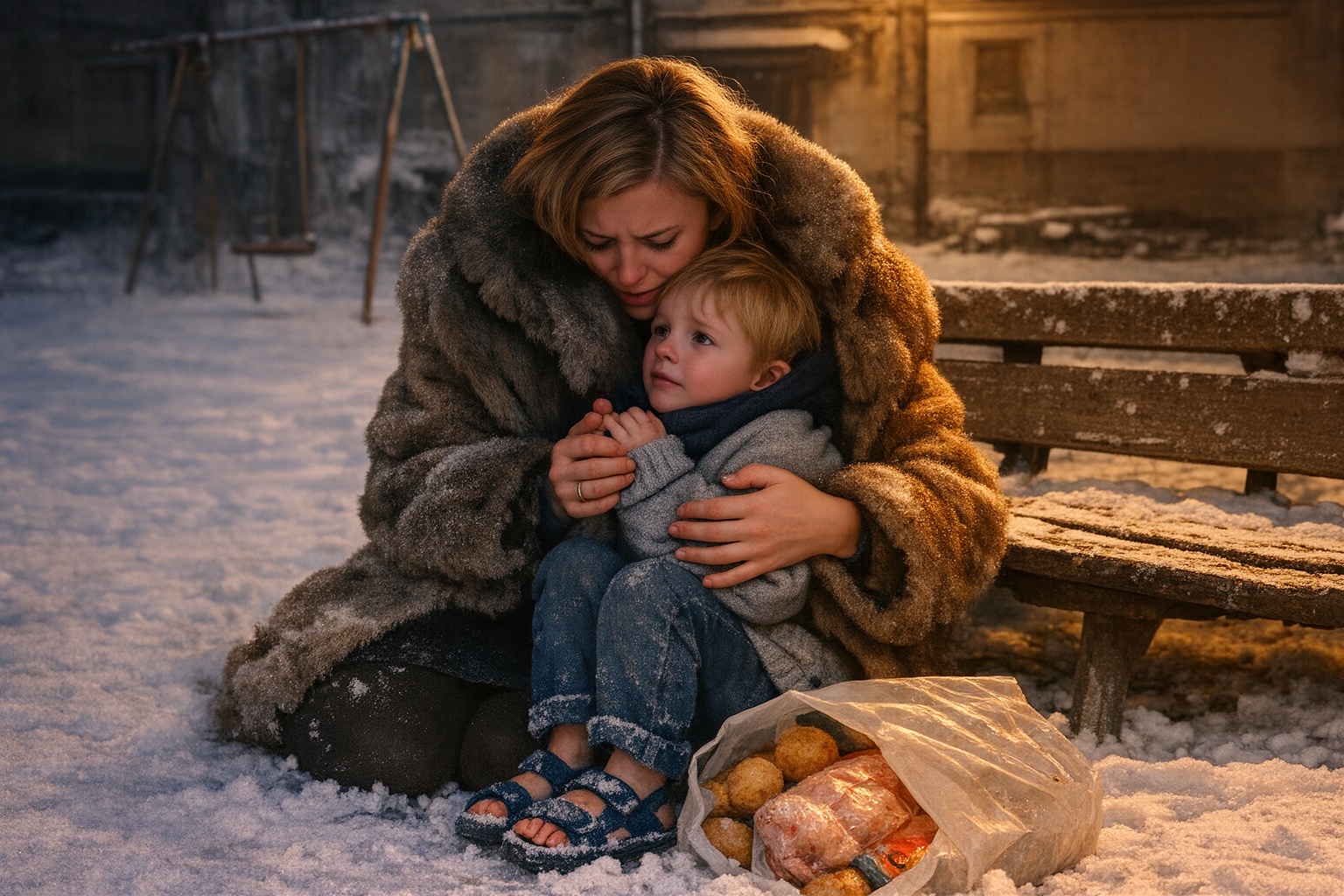 Пакет выскользнул из рук Ганны и рухнул на утоптанный снег. Не раздумывая ни о продуктах, ни о мармеладе, она кинулась к ребёнку.