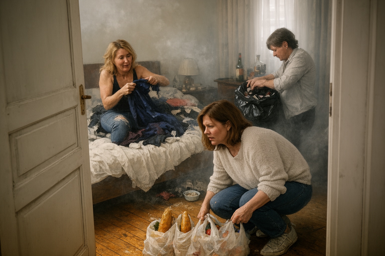 Внутри царил беспорядок. Прямо на светлом покрывале, не снимая уличных джинсов, устроилась Лариса, старшая сестра Александр. На полу вокруг неё были разбросаны вещи из шкафа Мария: шёлковые блузки, трикотаж, коробки с обувью.