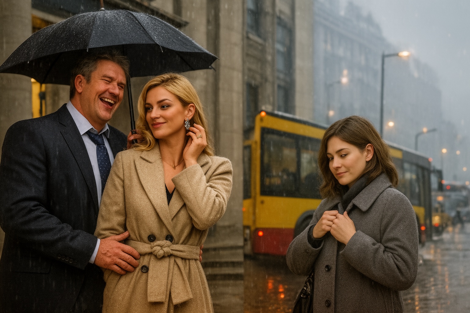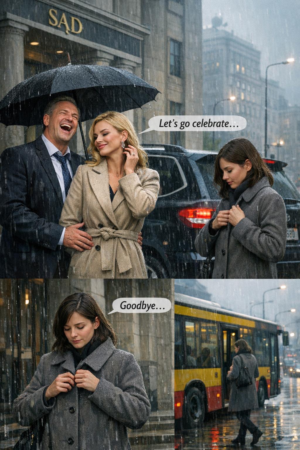 Дождь в тот день хлестал без передышки, стирая в серой пелене контуры здания суда. Капли глухо стучали по зонту Владимира Каминского, однако он будто вовсе не ощущал сырости и холода. Лицо его светилось победным самодовольством, а ладонь уверенно лежала на талии Дарины Назаренко. Та, облачённая в дорогое пальто с идеальной укладкой, смотрела на женщину в нескольких шагах от них с откровенной насмешкой.